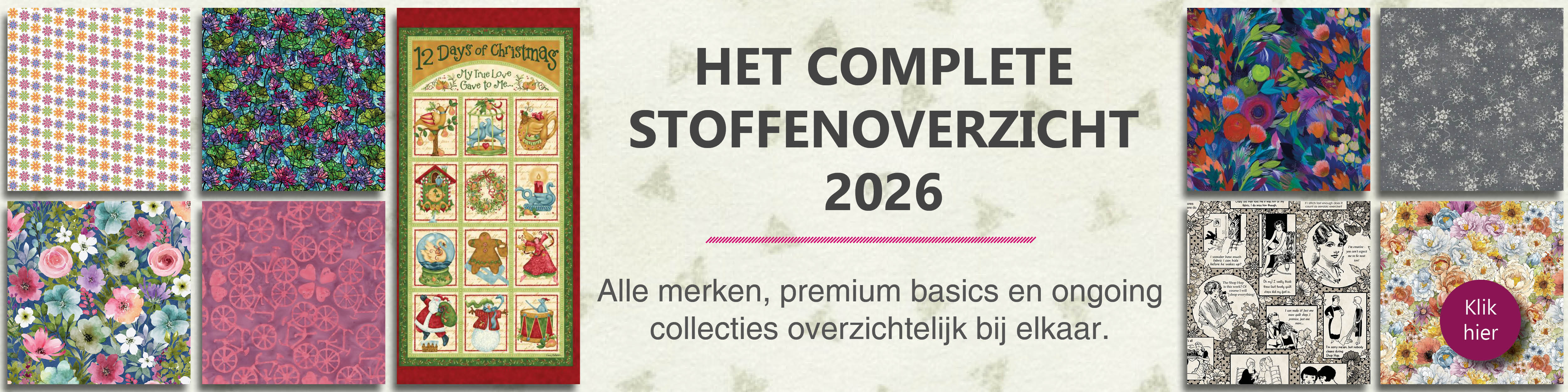 Regelmatig verschijnen nieuwe patchwork- en quiltcollecties. Uw keuze uit deze series kunt u eenvoudig via ons reserveren. Zodra de artikelen beschikbaar zijn, zorgen we ervoor dat u de allernieuwste stoffen snel in uw winkel heeft. Naast designercollecties bieden we een breed scala aan basisstoffen: meer dan 1.800 basics van prachtige kwaliteit, in alle denkbare kleuren en dessins, houden we op voorraad.